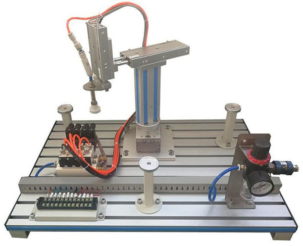 模型由回轉氣缸、雙軸氣缸、單軸氣缸、吸盤、真空發生器、電磁閥、節流閥、手滑閥、減壓閥、磁性開關、機械部件、工業鋁合金型材底板等組成,設有兩個抓取工位,可進行工件取放控制練習?砷_展對氣動機械手的操作及編程控制訓練。配有空氣壓縮機:靜音無油,工作電源AC220V±10% 50Hz,輸入功率0.68kW;公稱容積24L,理論流量:116L/min,額定輸出氣壓0.7MPa。
