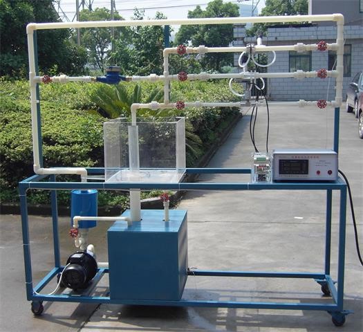 主要配置:移動式不銹鋼實驗臺、循環水箱;計量水箱;循環水泵;d=40mm、d=32mm、d=20mm、d=15mm測試管段;渦輪流量計;孔板流量計;文丘里流量計;翼片流量計;差壓傳感器;8點巡檢儀等。計算機接口。