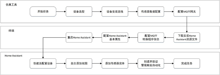 一、 智能家居應用系統需求分析 (1)實時了解客廳光照值、溫濕度值的變化;實時了解臥室的門磁開關狀態、人體監控;實時了解廚房的水浸和煙霧傳感器狀態 (2)實時控制警示燈的開關 (3)根據煙霧傳感器和水浸傳感器的感應值來自動化開關警示燈 (4)任意添加所需設備 二、 智能家居應用系統方案設計 (1)智能家居平臺選擇Home Assistant (2)選擇ZigBee網關對接設備和平臺 三、 智能家居應用系統項目實施 (1)在仿真設備平臺安裝智能家居設備并配置網關 (2)在虛擬機中安裝HA相關軟件 (3)對HA進行初始配置 (4)將設備圖標布局到Home Assistant的平面圖中并顯示設備數據 (5)在Home Assistant平臺上設計并實現自動化規則在仿真設備平臺上開啟實驗以驗證智能家居案例 |