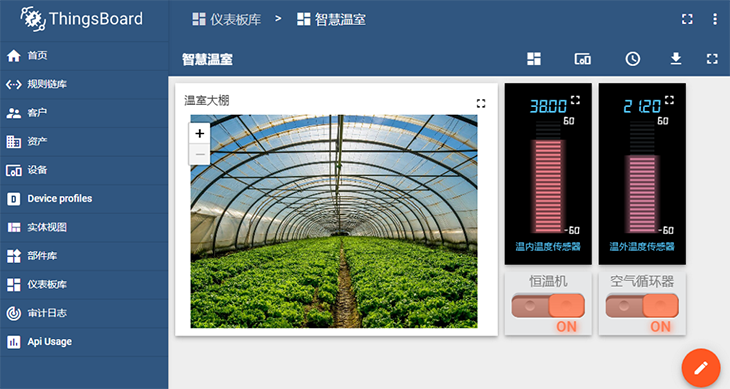 圖:智慧溫室課程案例,使用ThingsBoard云平臺的儀表板,對感知層設備上送的溫室環境數據與設備狀態進行展示。