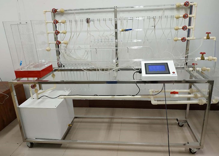 移動式不銹鋼實驗臺、儲水箱;雷諾測試管;伯努利測試管;沿程阻力系數測試管;突擴、突縮測試管;閥門局部阻力系數測試管;孔板流量計測試管;文丘里流量計測試管;和皮托管測試管;測壓板直接顯示總水頭線和測壓管水頭線;壓力傳感器24套、流量傳感器4套、溫度傳感器1套、觸摸屏、測壓板。