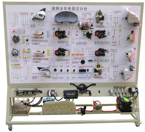 該設備采用 全新 大眾速騰1.6L 整車電器實物為基礎,充分展示汽車發動機防盜系統、儀表系統、燈光系統、雨刮系統、喇叭系統、點火系統、電動車窗系統、電動門鎖、音響系統、起動系統和充電系統等汽車電器各系統的組成結構和工作過程。