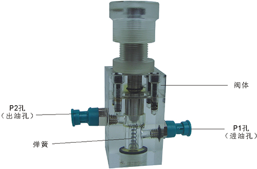 2、溢流閥結(jié)構(gòu)上參考了國產(chǎn)P-63B型低壓直動(dòng)式溢流閥,其閥體閥蓋、鎖緊螺母、調(diào)節(jié)螺母、螺塞等采用了進(jìn)口透明有機(jī)玻璃材料精制而成,閥芯、調(diào)節(jié)桿采用了45#中碳鋼材料。并配合彈簧,油接頭,密封圈等標(biāo)準(zhǔn)件裝配而成,通過它可明確地觀察到閥芯、彈簧、油孔等結(jié)構(gòu)及其運(yùn)行過程,具有形象逼真,性能可靠等優(yōu)點(diǎn)。它即可作為教學(xué)模型,也可以作為液壓實(shí)驗(yàn)元件進(jìn)行實(shí)驗(yàn)演示。